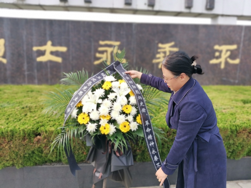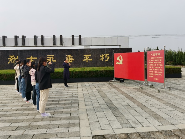 党支部一行10人第一站到达了步凤镇五条岭烈士陵园。烈士陵园气氛庄严肃穆,14:20纪念活动正式开始。首先,党员代表向烈士敬献花篮,党支部纪检监察委员、副院长贾妍春上前整理挽联。在场人员静默致哀,缅怀革命先烈。接着,在纪念碑前全体党员对着庄严的党旗,共同重温入党誓词。 随后,“中国好人”五条岭烈士陵园守墓人卞康全介绍了陵园的革命历史故事,重点介绍了王友权革命烈士的英雄事迹及“友权村”命名的原因。最后,全体党员绕陵园一周瞻仰革命烈士纪念碑。