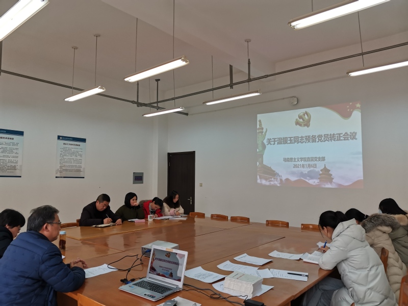 2021年1月6日,马克思主义学院直属党支部在图文信息中心2楼马院会议室召开关于温银玉同志预备党员转正大会。会议由党支部组织委员贾妍春主持,马院党员教师出席会议。