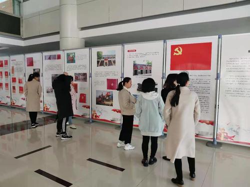 第二部分由党支部组织委员贾妍春带领全体党员现场参观图文信息中心一楼的“不忘初心、牢记使命——党旗、党徽、党章专题展”,并进行“我与党旗合影”、 “我与国旗合影”互动活动。