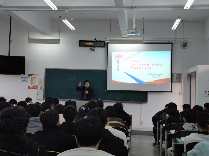 11月15日下午,组织部部长吉鸿在公共教学组团5503教室为信息与安全学院移动2111、云计算2111、云计算2131专业的学生讲授了以《完善“一国两制”制度体系 护航香港长治久安》为专题的“形势与政策”课。