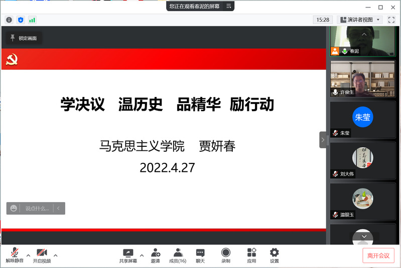 贾妍春副院长以《学决议,温历史,品精华,励行动》为题,带领全院教师学习,全面回顾了党走过的百年奋斗历程,梳理了十三个方面的重大成就,总结“十个坚持”的历史经验,揭示了“过去我们为什么能够成功、未来我们怎样才能继续成功”的深层逻辑,是我党百年历史发展的重要成果,也是应对百年未有之大变局,实现不断从胜利走向胜利的思想武器。
