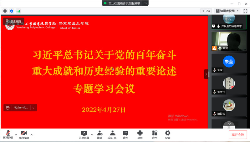 4月27日下午,马克思主义学院举行专题学习会,深入学习领会习近平总书记关于党的百年奋斗重大成就和历史经验的重要论述,院长许俊生主持会议,副院长贾妍春带领学习。