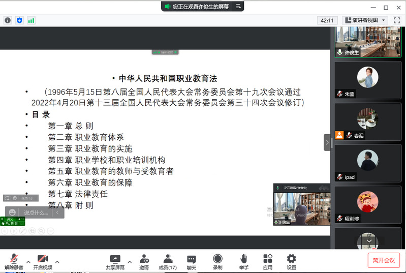 其次,许俊生书记带领学习新修订的《中华人民共和国职业教育法》。《职业教育法》内容全面丰富,充分吸收了党的十八大以来职教改革发展成果,将若干重大改革举措上升为法律条款,成为庄严公正和权威的“定海神针”,为职业教育高质量发展提供了坚实保障。我们坚信,在新的伟大征程上,职业教育前景广阔、大有可为。