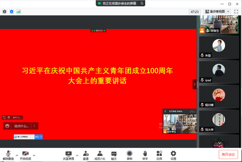 最后,许俊生书记带领学习习近平在庆祝中国共产主义青年团成立100周年大会上的重要讲话。习近平总书记一直高度重视共青团工作、高度关心青年,对青年工作倾注了大量心血,推动青年发展事业实现全方位进步、取得历史性成就。我们要学深悟透总书记重要讲话精神,深刻感悟习近平总书记对青年工作和中国青年倾注的深切关怀和极大心血,增强“四个意识”、坚定“四个自信”,坚定不移做“两个确立”忠诚拥护者、“两个维护”示范引领者。