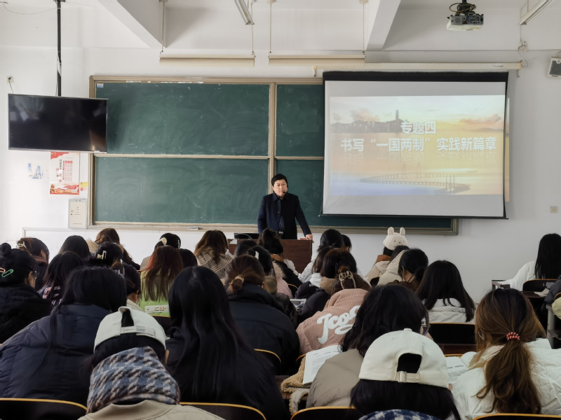 12月2日下午,学校党委委员吉鸿走进课堂,在公共教学组团3301教室为药品与健康学院幼管2234、2235班的学生讲授了以《书写“一国两制”实践新篇章》为题的“形势与政策”课。