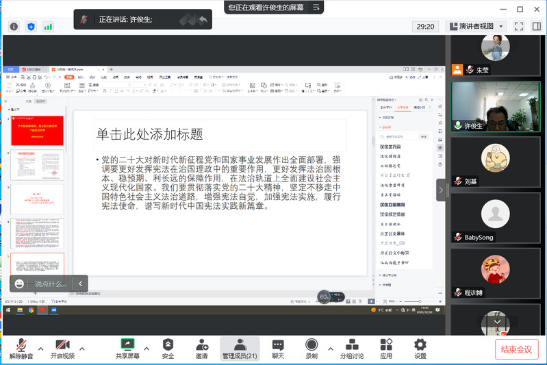 2022年12月30日下午,马克思主义学院通过腾讯会议开展“学思践悟凝共识,勠力同心谋发展”主题党日活动,马院全体党员教师出席,党支部书记许俊生主持会议。