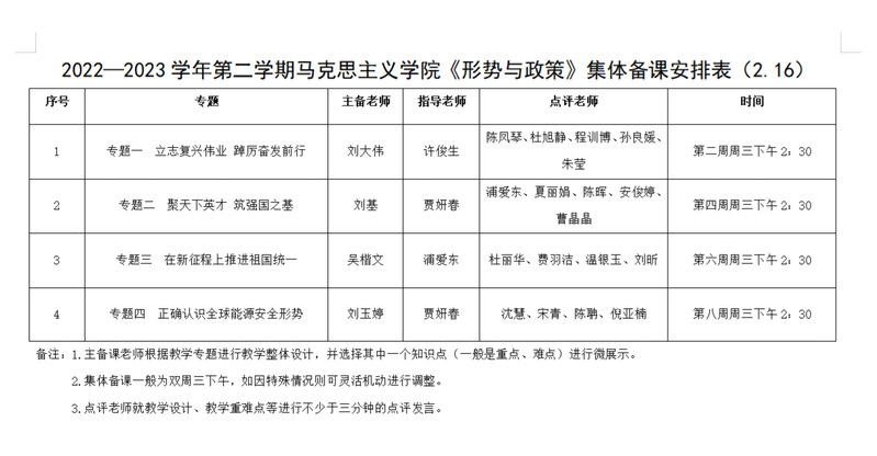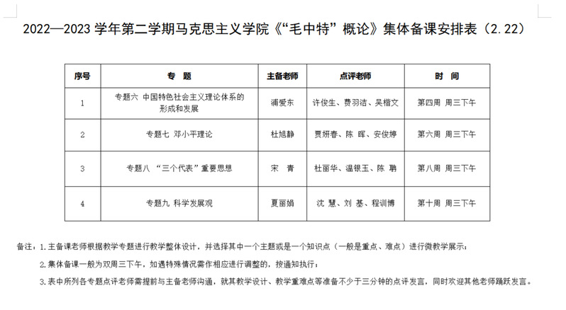 2022-2023学年第二学期《习近平新时代中国特色社会主义思想》集体备课安排表(2.21)