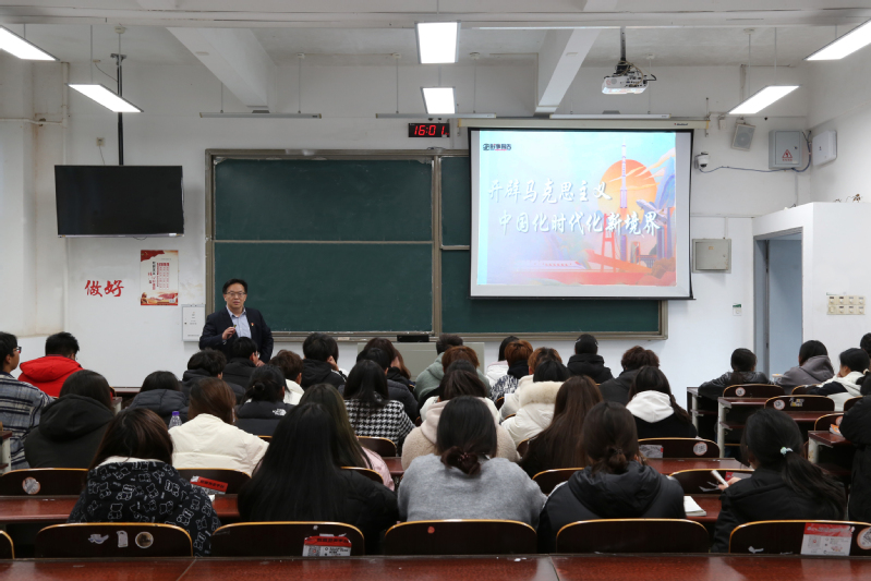 11月23日,校长刘玉申以《开辟马克思主义中国化时代化新境界》为题,为经贸管理学院电子商务2311、2312、2313班的同学讲授“形势与政策”课。