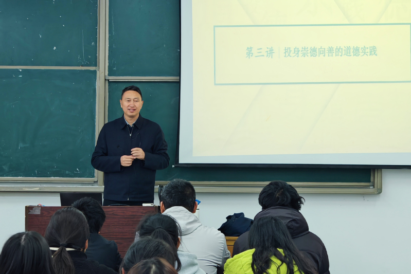 11月25日,校党委书记邵从清以《投身崇德向善的道德实践》为主题,为商学院电商2411、2431班的同学讲授“思想道德与法治”课。