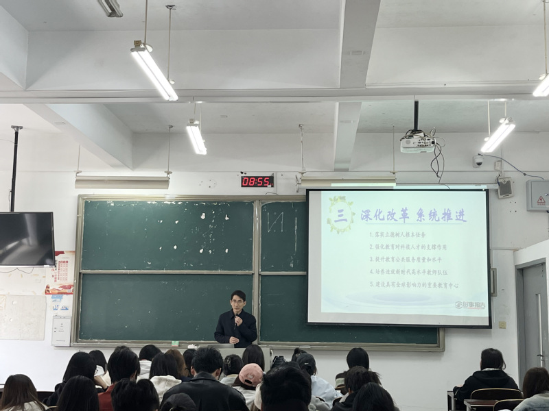 4月9日,副校长陈宏武以《从教育大国迈向教育强国》为题,为艺术设计学院建筑室内2312、室内设计2311、广告2331班学生讲授“形势与政策”课。