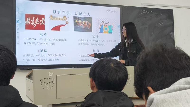 班会紧扣“守和谐、崇求实、谋新篇、焕新颜”四个维度,通过设置“图书馆静默”“团队协作”等情景引导讨论,深入剖析和谐环境的“滋养力”与涣散环境的“损耗力”,引导学生认识到个体在校风建设中的主体责任。班会着重强调了“崇求实”中求真、诚信、实干、担当的内涵,呼吁学生筑牢诚信根基,以真实能力涵养品格,并将个人规划融入集体发展,从维护环境整洁、展现精神风貌等点滴做起,共同推动校园新风尚的形成。